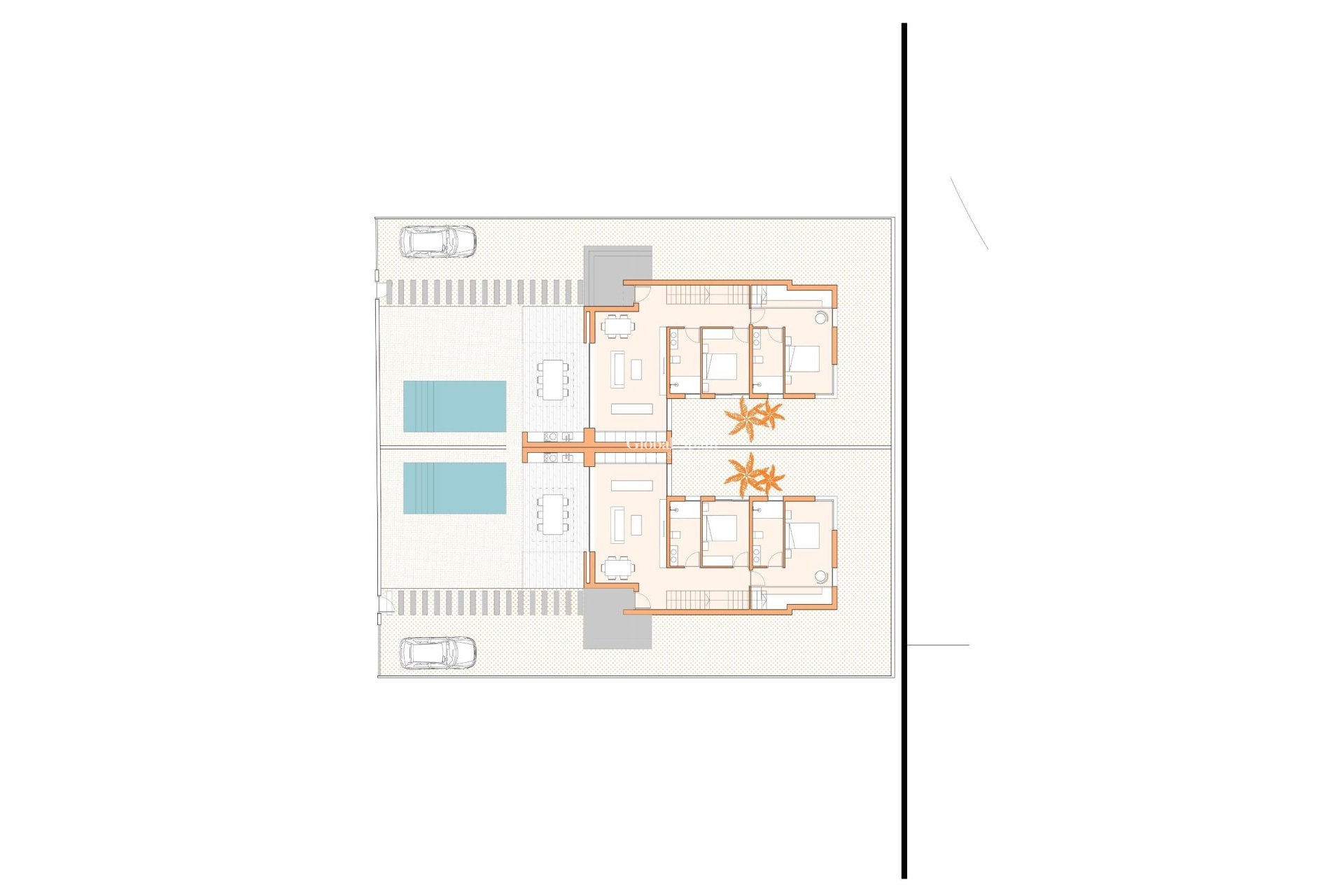 Neu gebaute Doppelhaushälften mit offener Küche, 3 Schlafzimmern, 3 Bädern, Terrasse, privatem Garten mit Pool und Parkplatz.