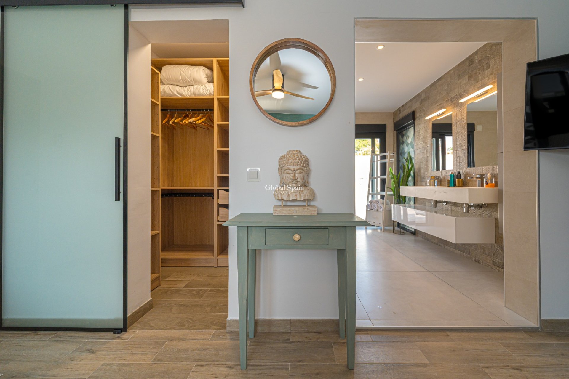 Das automatische Tor ermöglicht einen bequemen Zugang zum Grundstück, das ausreichend Parkplätze für bis zu vier Fahrzeuge bietet. Die Villa verfügt zudem über hervorragende Stauraumlösungen mit einer Garage, einer Speisekammer im Haus und einem Abstellraum im Freien .
