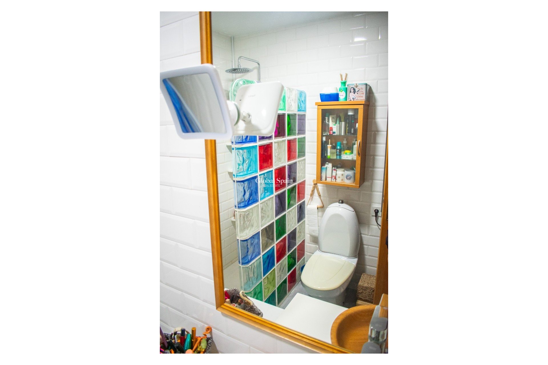 La propiedad dispone de tres amplias habitaciones con armarios empotrados, dos elegantes baños totalmente reformados, uno de ellos en suite, una cocina americana de diseño integrada en un espacioso salón con acceso directo a la terraza. La joya de esta vivienda es su impresionante terraza acristalada de 25 m² tipo office, ideal para disfrutar del mar durante todo el año, protegida por una estilizada cortina de cristal que garantiza luminosidad y aislamiento. La entrada está adornada con una distinguida puerta mallorquina, que aporta carácter y privacidad.