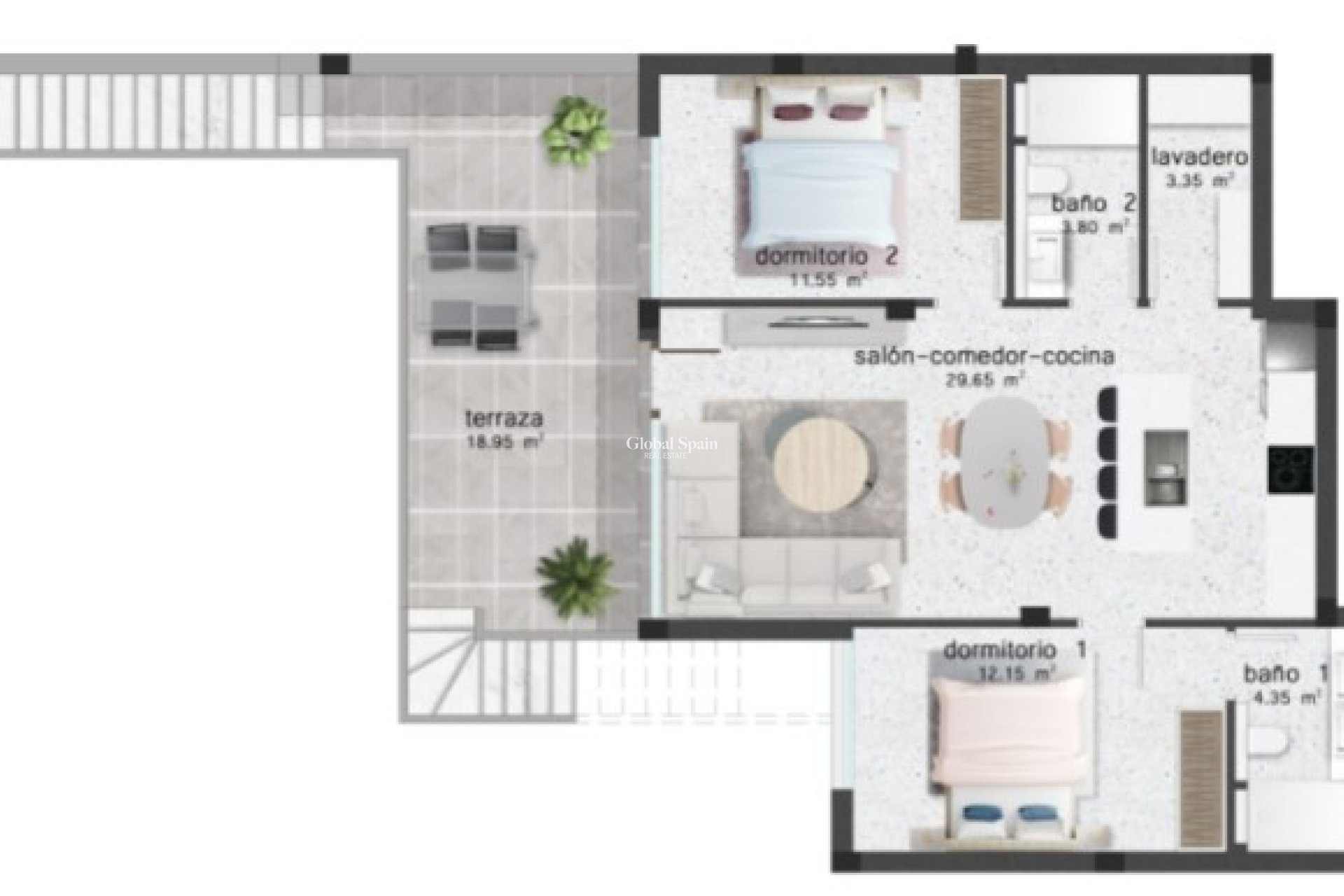 Estos apartamentos disponen de 2 dormitorios, 2 baños, terraza (+- 19m²) y solárium (+- 78m²).