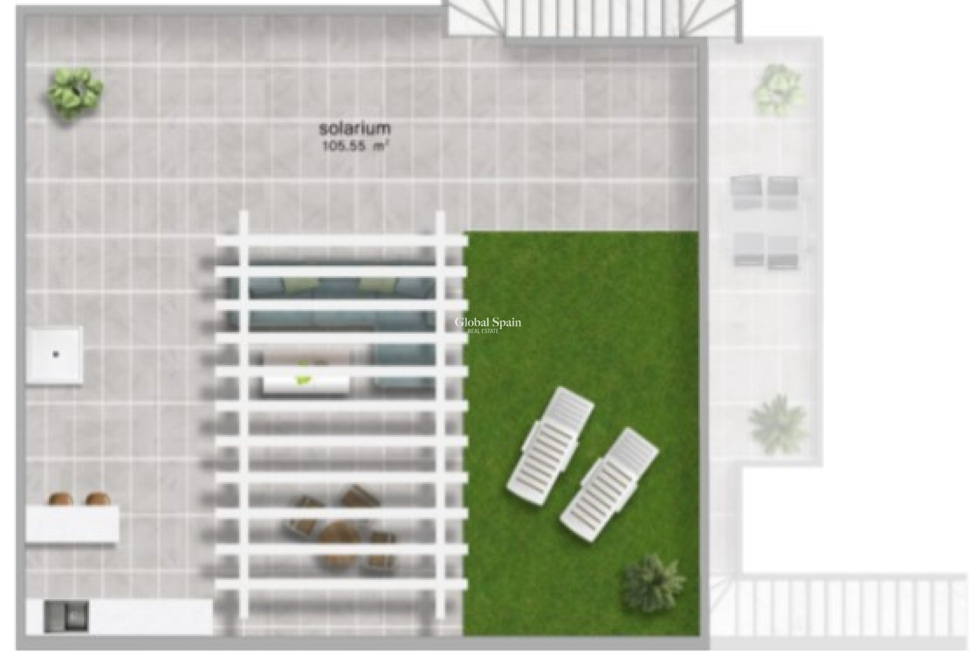 - En el solárium: cocina de verano + pérgola + iluminación + césped artificial