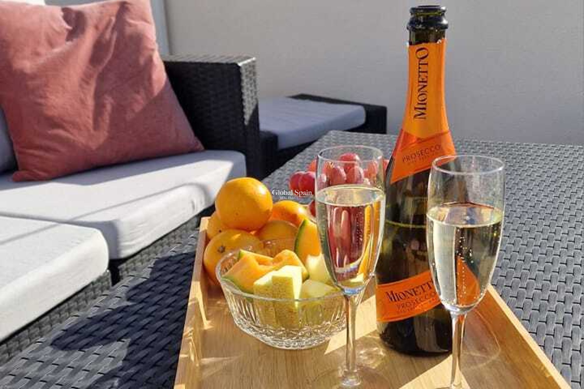 Magnifique penthouse à Vistabella Golf - Cet appartement lumineux est meublé avec goût. La cuisine et le salon forment un espace ouvert et aéré. Il comprend deux chambres et deux salles de bains. Orienté plein sud, il bénéficie d'un agréable balcon accessible depuis le salon et d'un escalier menant à une terrasse sur le toit de 80 m². L'appartement est entièrement meublé : vaisselle, rideaux, linge de lit, etc. Le salon est équipé d'un canapé neuf et d'un lave-linge neuf. Le balcon dispose d'une table et de chaises. La terrasse sur le toit est aménagée avec une pergola, un canapé, une table et des transats. L'appartement possède une licence touristique. Vistabella Golf est une petite ville charmante en plein développement. On y trouve tous les services : épicerie, pharmacie, médecin, coiffeur, restaurants, bars. Un superbe parcours de golf est également en cours d'aménagement.
