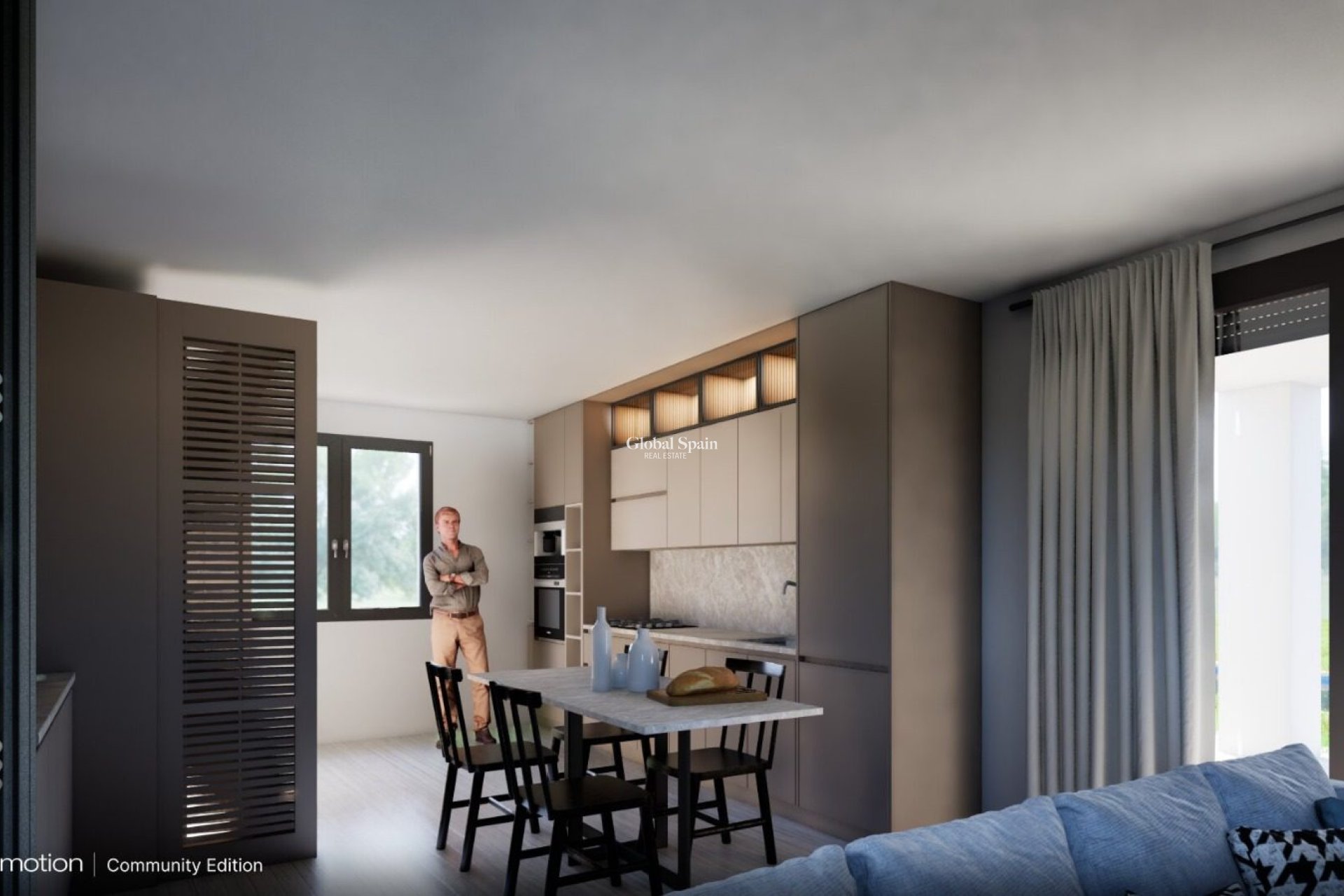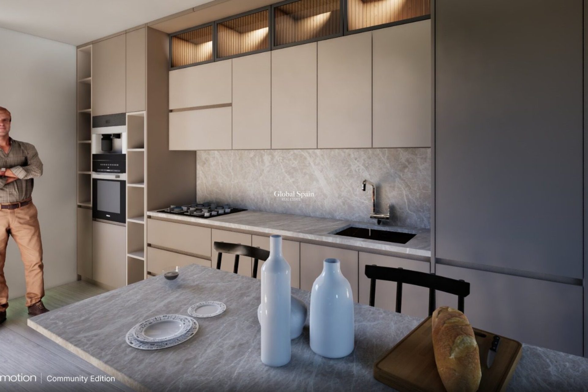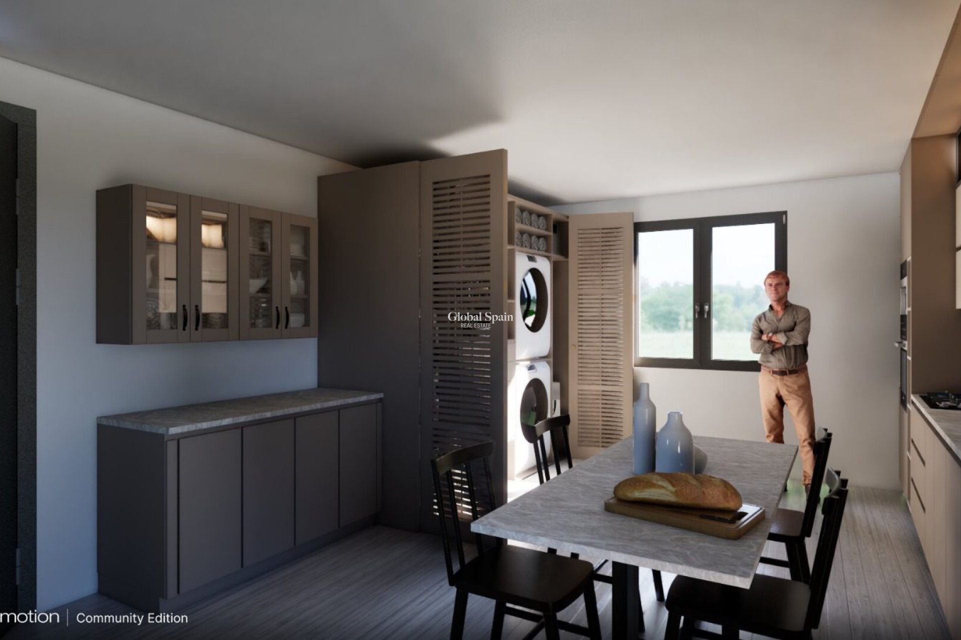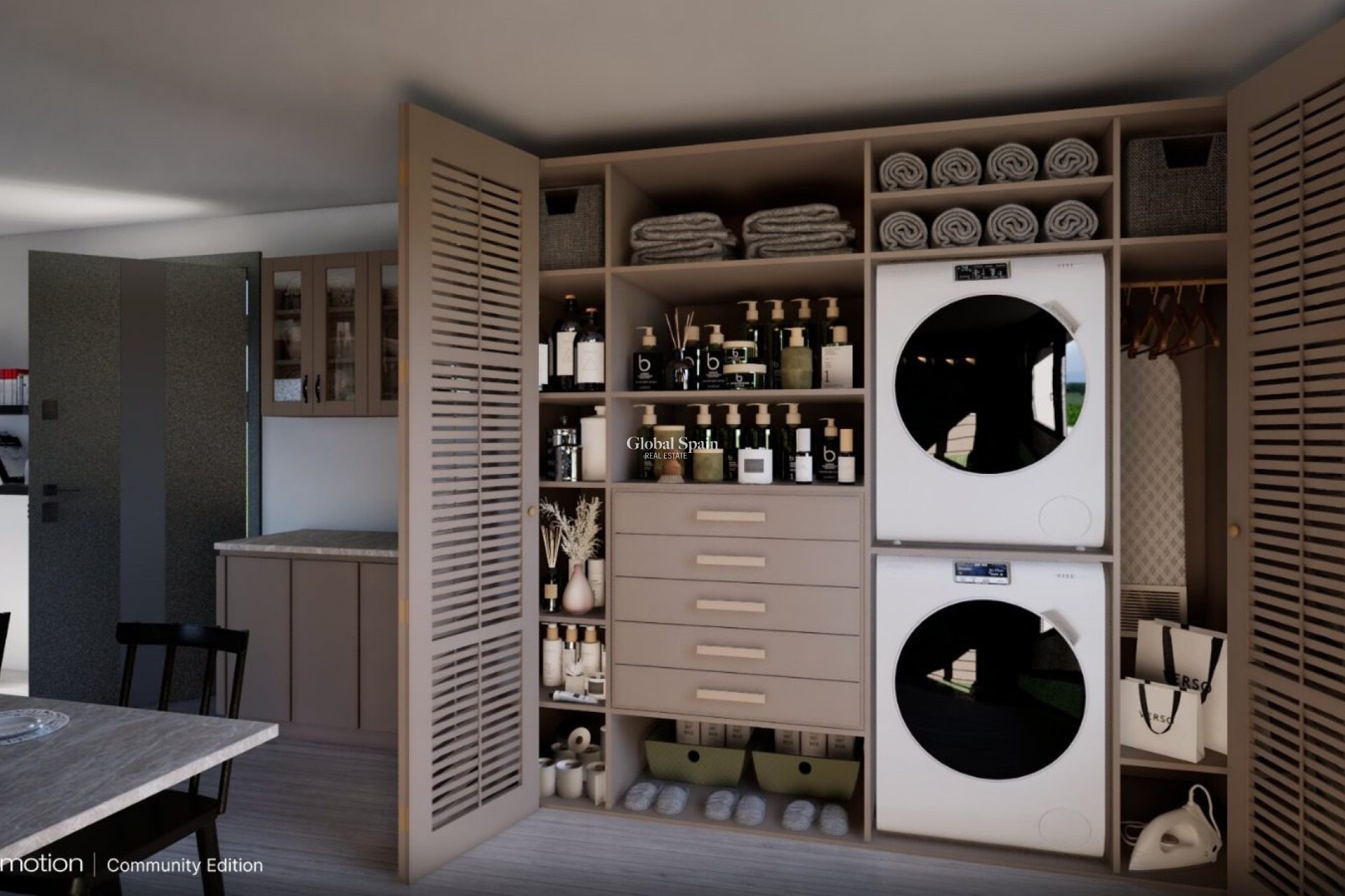 Keuken:De keuken is uitgerust met boven- en onderkasten, en het werkblad is van het type “Silestone” of vergelijkbaar. Een roestvrijstalen spoelbak wordt geïnstalleerd, evenals de voorbereidingen voor een wasmachine en droger.