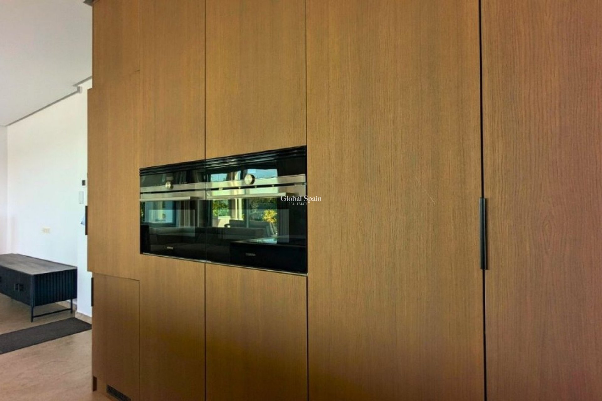 Een ruime woon- en eetkamer met een moderne keuken, die dankzij de grote schuifdeuren overvloedig natuurlijk licht binnenlaat. De schuifdeuren verdwijnen in de muur, waardoor u naadloos toegang heeft tot het beneden terras, het zwembad en de tuin.