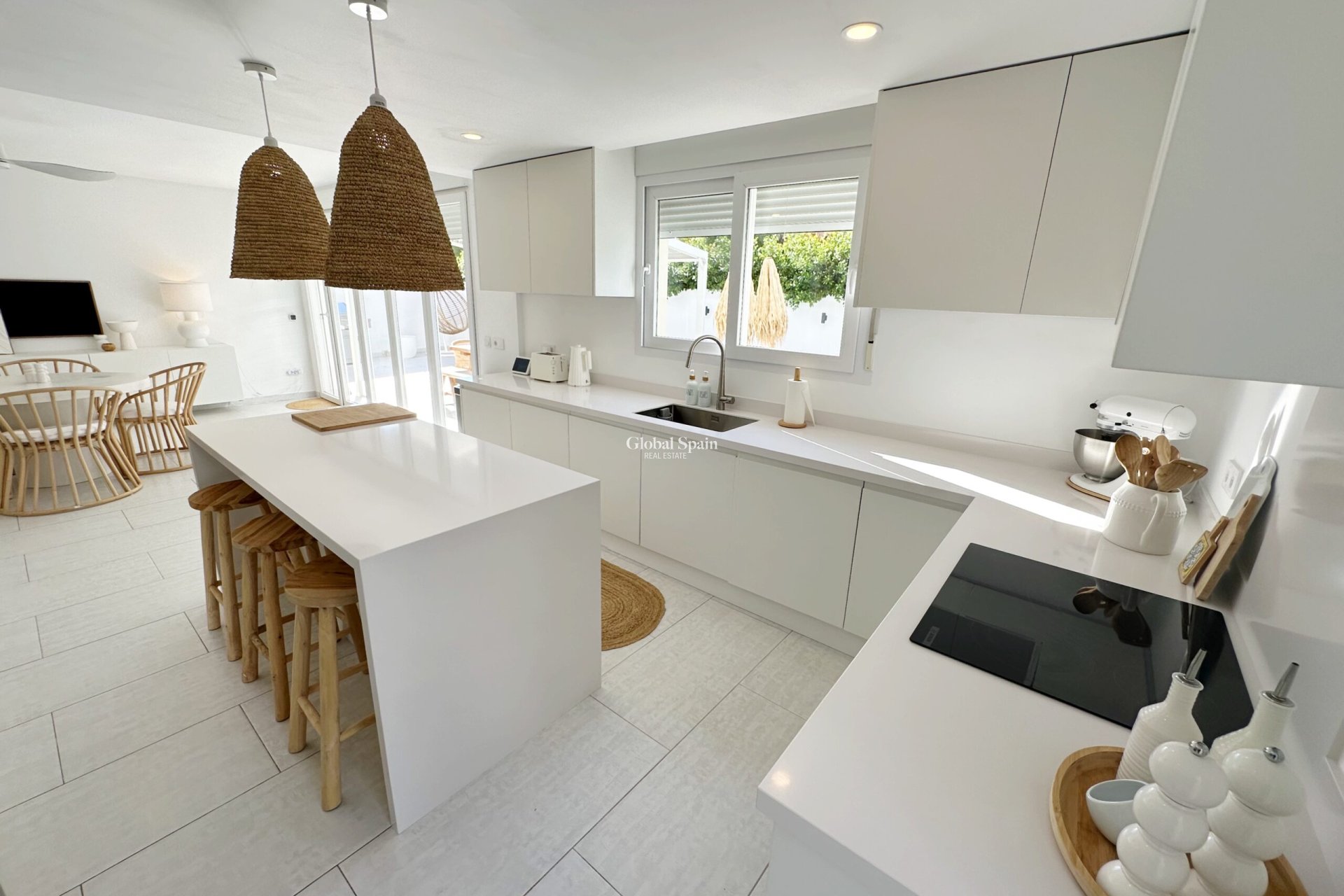 Met trots bieden wij deze prachtige, volledig gerenoveerde Baron-villa te koop aan op het Mar Menor Golf Resort. Het is werkelijk een unieke en schitterende villa. De villa is gelegen op het zuidwesten en heeft een beschutte tuin met een privézwembad. De eigenaren hebben de benedenverdieping volledig gerenoveerd en een open leefruimte gecreëerd met een op maat gemaakte keuken, bijkeuken, een rustgevende zithoek en een zonnige eetkamer met openslaande deuren naar het terras. Op de bovenverdieping is een extra slaapkamer gecreëerd, die is omgetoverd tot de droom van elke vrouw: een ruime kleedkamer en een inloopkast. De woning is voorzien van zonnepanelen, centrale verwarming op gas en airconditioning en wordt gedeeltelijk gemeubileerd verkocht. De villa heeft een fantastische ligging op het resort, op loopafstand van de supermarkt en de MMGR-club met minigolf, padel, fitnessruimte en restaurant. Het strandplaatsje Los Alcazares aan de Mar Menor ligt op korte rijafstand, de luchthaven van Murcia op 20 minuten en Alicante op ongeveer een uur rijden. De villa biedt een prachtig uitzicht aan de voorzijde op een plein met een fontein. De eigenaren hebben een kantoor met aparte ingang aan de rechterkant van de woning gebouwd. Deze ruimte kan gebruikt worden als kantoor of fitnessruimte. U komt de villa binnen in de nieuw betegelde hal met de trap aan de rechterkant en een toilet beneden. Deze leidt naar de prachtige open keuken met eethoek. U vindt er een op maat gemaakte witte hoogglans keuken met ingebouwde apparatuur, een kookeiland met opbergruimte en zitgelegenheid en een fantastische open voorraadkast. Wij zijn jaloers op deze keuken! Er is een ruime eethoek - perfect voor het ontvangen van gasten of familiebijeenkomsten. Direct naast de keuken met eethoek bevindt zich de ruime woonkamer met een grote L-vormige bank. Openslaande deuren verbinden de buitenruimte met de overdekte pergola en het terras waar u buiten kunt dineren. De tuin is volledig betegeld en heeft diverse opbergkasten aan weerszijden van de villa. U vindt er een prachtig verwarmd zwembad in een zeer privé tuin met voldoende ruimte om te zonnebaden en te entertainen. Aan de voorzijde is een oprit met parkeergelegenheid. Boven zijn er vier slaapkamers. De hoofdslaapkamer heeft inbouwkasten en een nieuw geïnstalleerde en-suite badkamer met douche. Er zijn twee tweepersoons gastenslaapkamers en een enorme familiebadkamer met inloopdouche en een gigantisch bad. De vierde slaapkamer wordt gebruikt als kleedkamer met een aparte inloopkast – een fantastische benutting van de ruimte. Alle vloeren en badkamers zijn vernieuwd. Deze op maat gemaakte, volledig gemoderniseerde villa beschikt over hoogwaardige afwerkingen, een open leefruimte en een speciaal ontworpen kleedkamer die zowel elegantie als functionaliteit combineert. Neem nu contact met ons op om een bezichtiging in te plannen, u zult niet teleurgesteld zijn.