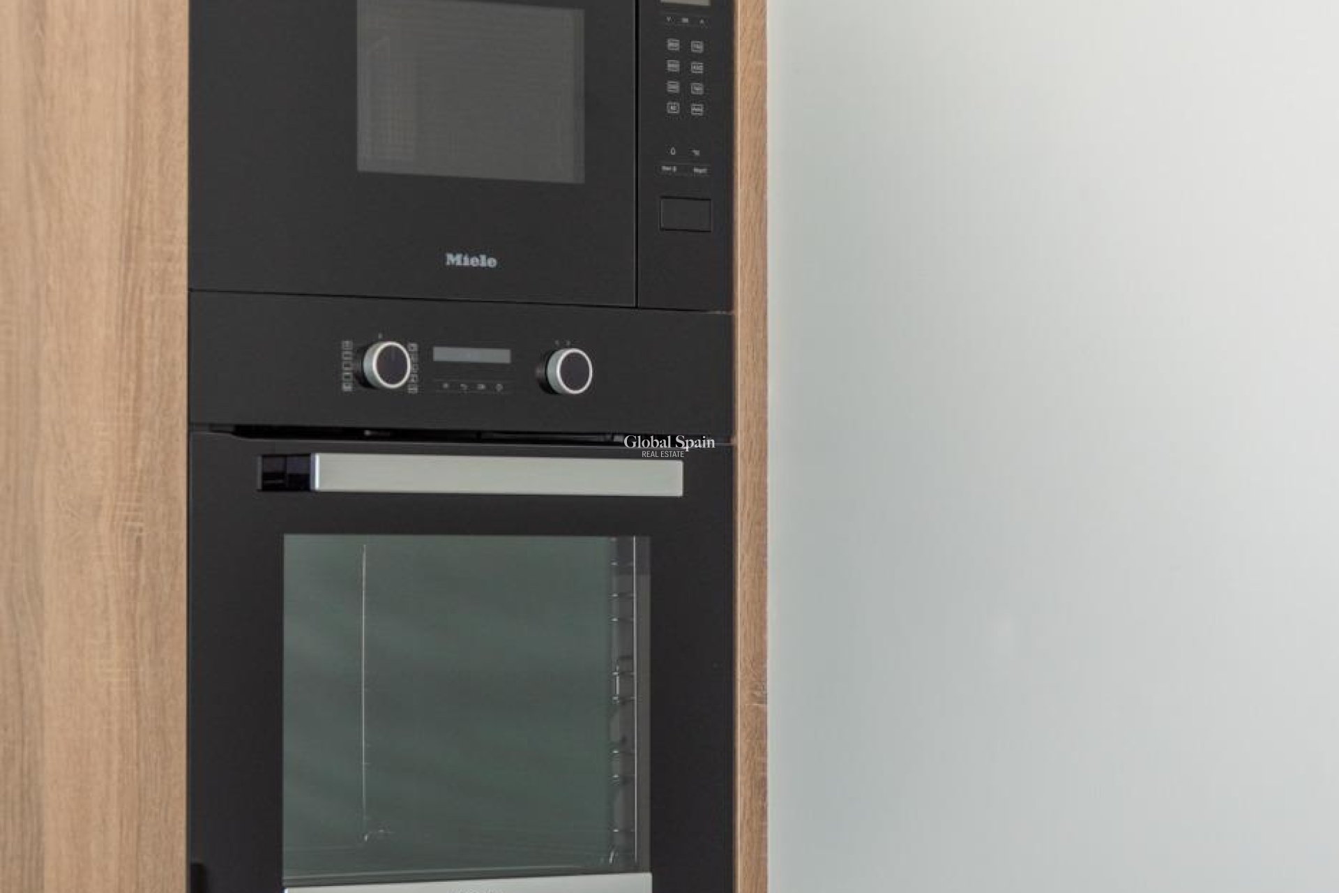 Volledig ingerichte keuken in wit glans of houtkleur. Technologisch kwarts. Roestvrij stalen gootsteen. Inductiekookplaat met geïntegreerde afzuigkap, oven, magnetron, wasmachine, geïntegreerde koelkast, geïntegreerde vaatwasser.