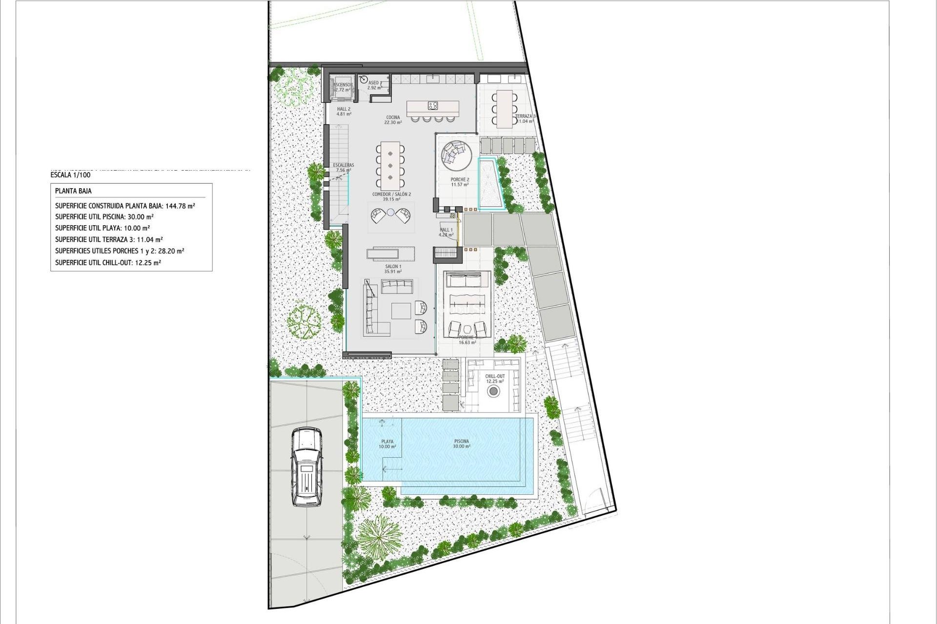 De begane grond beschikt over een ruime open keuken en woonkamer die uitkomt op uitgebreide terrassen en een chill-outruimte bij het zwembad.
