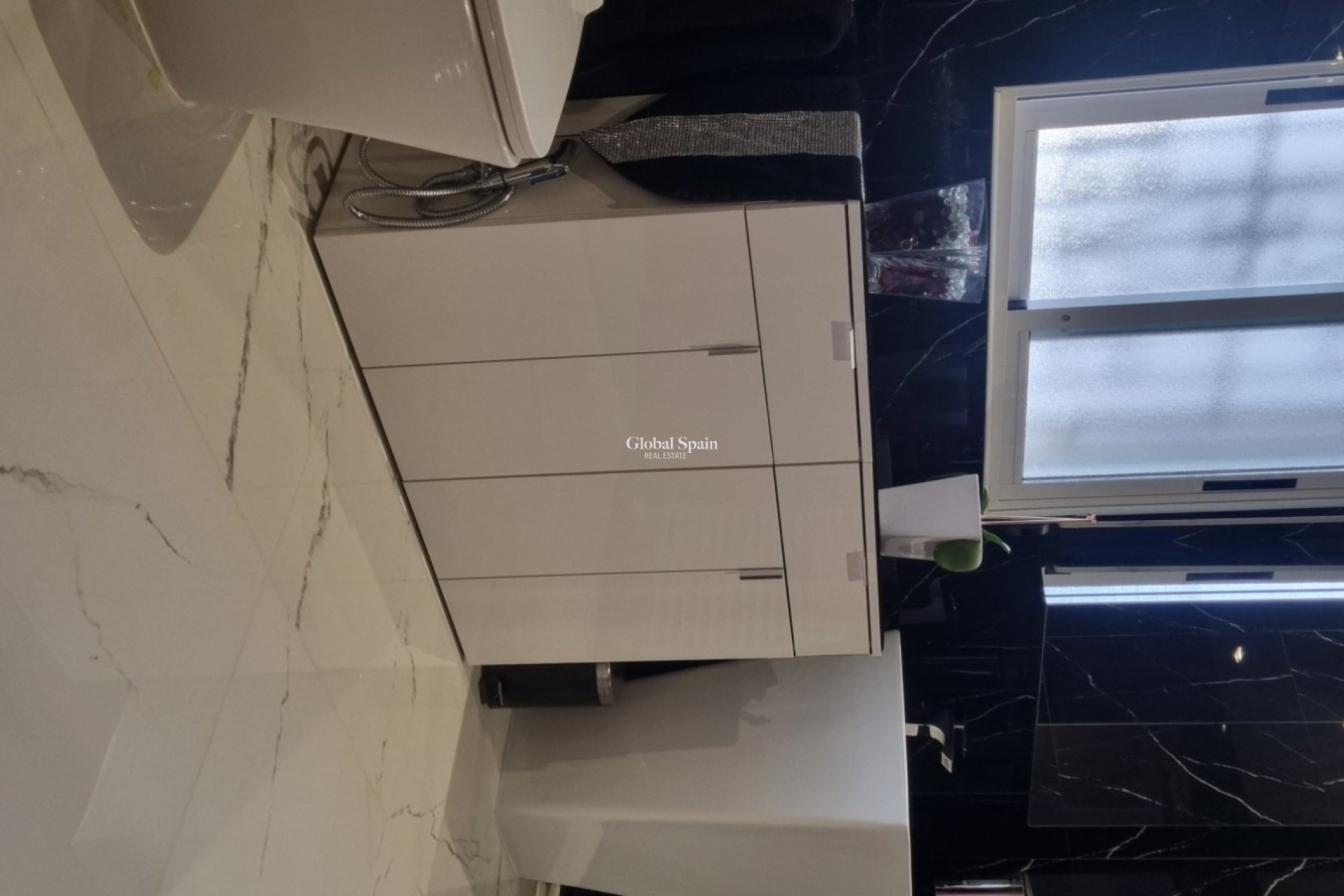 De villa zelf is enorm, je komt binnen via de veranda, waar een eettafel staat en nog een grote bank. De veranda is voorzien van grote ramen, zodat je van het uitzicht kunt genieten. Op de begane grond bevindt zich één slaapkamer met ensuite, een gastentoilet, een grote woonkamer met aparte kantoorruimte en een grote keuken met washok. De keuken is custom made met rode marmeren bladen en een custom made bijpassende eettafel, eveneens te gebruiken als eiland. De kantoorruimte is verder de enige ruimte in het huis waar nog geen renovatie heeft plaatsgevonden.