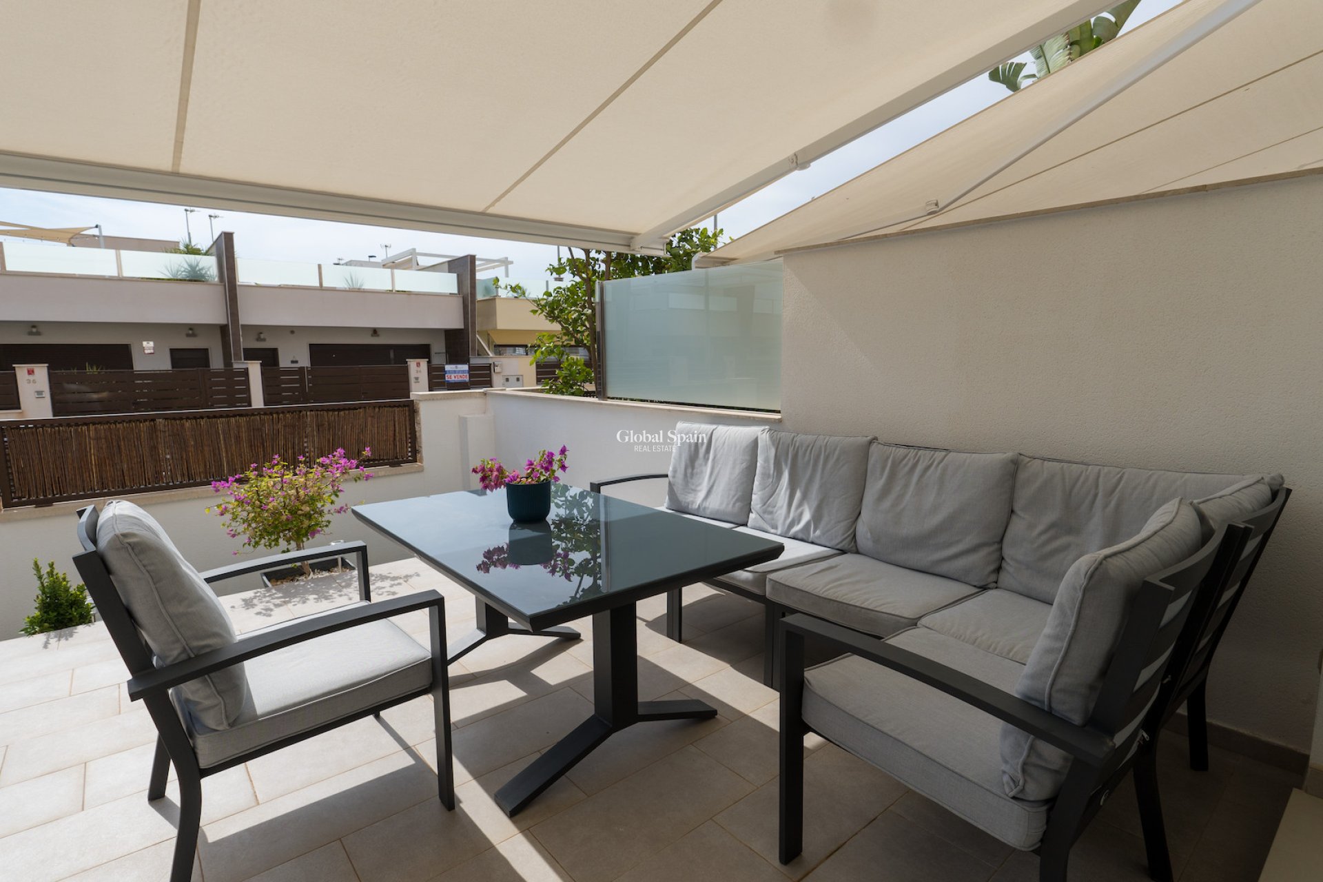 Prawie nowy dom szeregowy na sprzedaż. Piękny i nowoczesny, zadbany dom w San Pedro del Pinatar. Sprzedawany z ładnymi, nowoczesnymi meblami. Ten nowoczesny dom został wybudowany w 2019 roku i ma powierzchnię 205 m². Jest to ciągły dom szeregowy z ogrodem wyłożonym płytkami z przodu i z tyłu. Dom posiada cztery przestronne sypialnie (w tym jedną na parterze), trzy dobrze wyposażone łazienki, jasny salon z wyjściem na przestronny ogród oraz otwartą kuchnię z dużą ilością miejsca do pracy. Parking w garażu podziemnym. Układ pomieszczeń jest jasny i otwarty, z dużą ilością naturalnego światła. Z przodu i z tyłu domu znajduje się ogród, taras z sypialni na piętrze oraz duży, słoneczny taras na dachu. Taras na dachu oferuje słońce przez cały dzień, a także dużą pergolę, którą można rozłożyć, aby zapewnić cień w najgorętsze dni. Z tarasu roztacza się widok na wspólny basen i ogród. Dom posiada wbudowaną klimatyzację z funkcją ogrzewania i chłodzenia we wszystkich pomieszczeniach i nadaje się do zamieszkania przez cały rok. Dom sprzedawany jest z ładnymi meblami. Nieruchomość znajduje się w bezpiecznym, ogrodzonym kompleksie z dużym wspólnym basenem, idealnym do relaksu i cieszenia się ciepłym klimatem. Kilku sąsiadów to Skandynawowie. Najbliższa plaża znajduje się około 1,3 km od domu, a wszystko, czego potrzebujesz na relaksujący urlop, jest również w zasięgu krótkiego spaceru. Możesz zostawić samochód w garażu na cały pobyt. SAN PEDRO DEL PINATAR; San Pedro del Pinatar to przytulne nadmorskie miasteczko w regionie Murcia. Doskonała lokalizacja nad laguną Mar Menor, popularnym miejscem turystycznym z plażami, portem rybackim i rezerwatami przyrody. Miasto oferuje kąpiele solankowe z leczniczymi kąpielami błotnymi, które podobno mają właściwości zdrowotne. Znajduje się tu kilka restauracji i sklepów, a także tętniące życiem miejsce do wędkowania. Na plaży można uprawiać różne sporty wodne, nurkowanie, żeglarstwo i surfing. Jeśli chcesz wybrać się na zakupy na bulwar Zenia, zajmie Ci to tylko 10 minut jazdy samochodem. Lotnisko w Alicante oddalone jest o około 50 minut jazdy. Ta atrakcyjna nieruchomość jest idealna dla osób poszukujących spokojnej lokalizacji z dobrym dojazdem i udogodnieniami w pobliżu. Aby uzyskać więcej informacji lub umówić się na oglądanie, skontaktuj się z Feriebolig Utland już dziś.