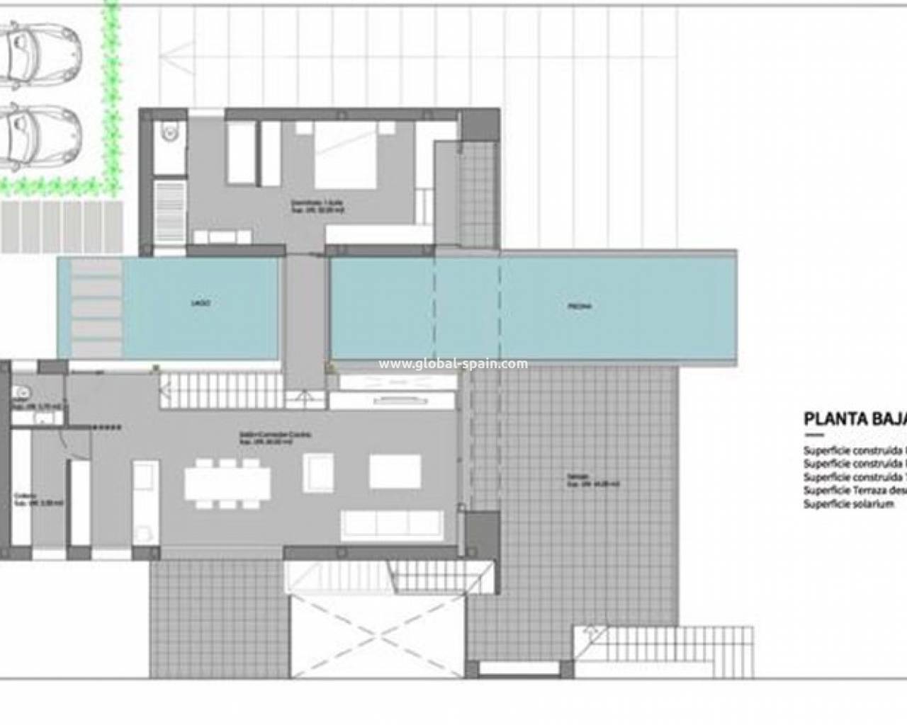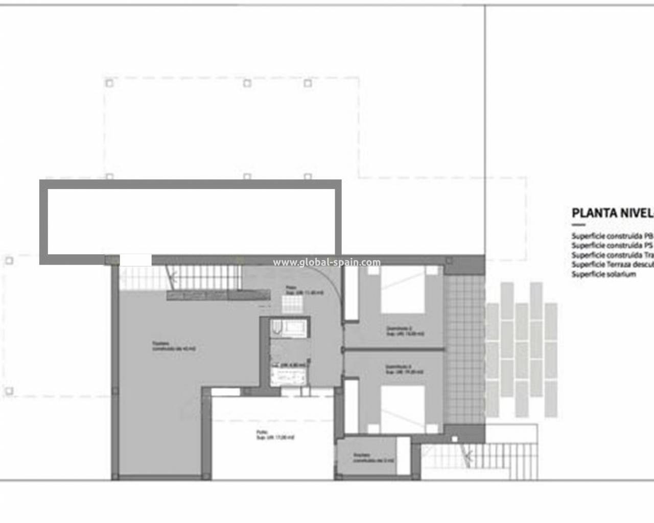 In the villa you have on one side the master bedroom with en-suite bathroom and a single bedroom and on the other side of the villa there are two more double bedrooms and a family bathroom.