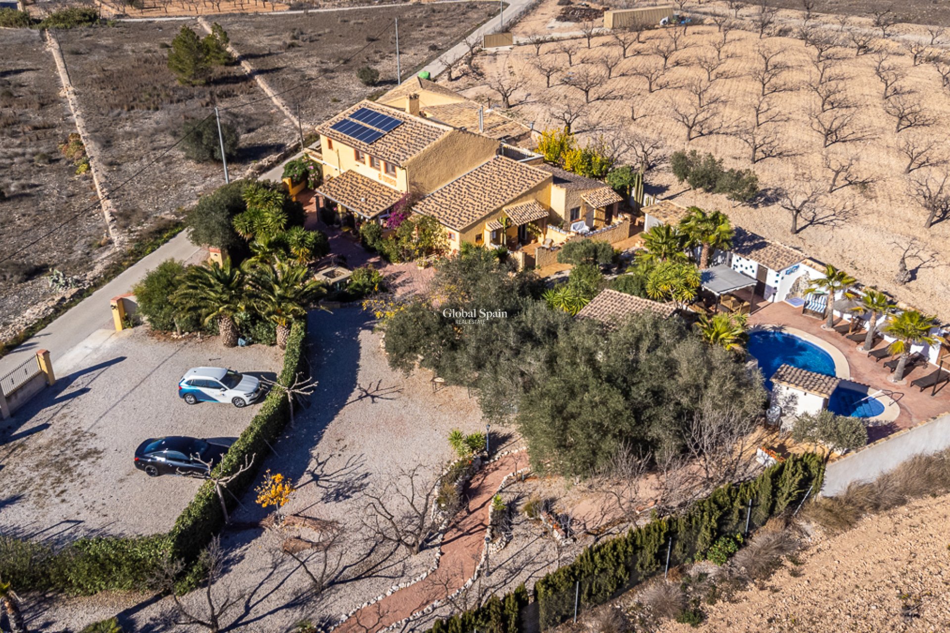 The property features a private swimming pool , surrounded by sun beds and a sun terrace, ideal for relaxing and enjoying the beautiful weather. The finca is surrounded by lush, well-kept gardens , with flowers, olive trees and fragrant citrus trees, adding an extra sense of tranquility and beauty.