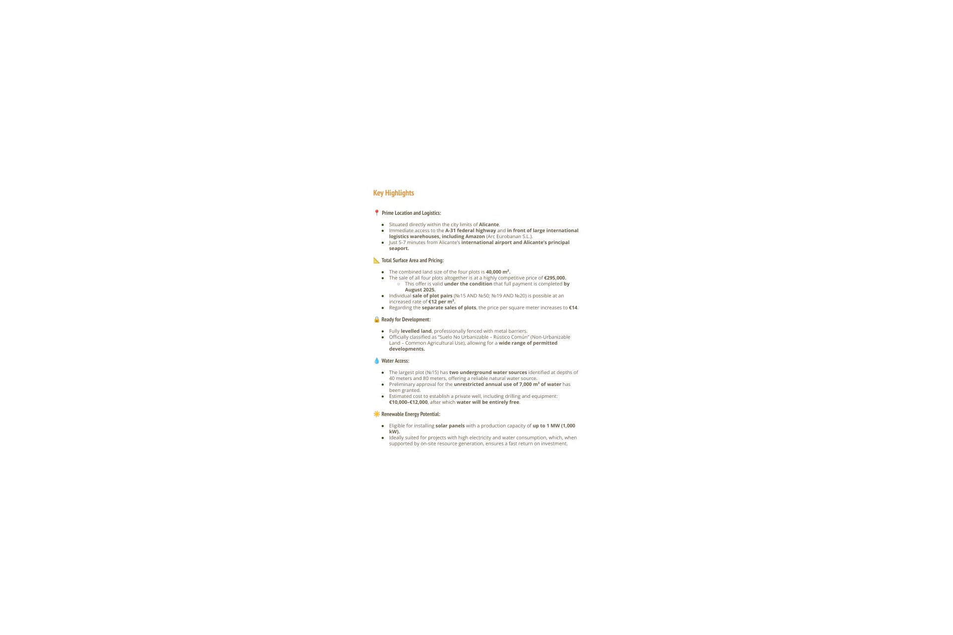 Unique Opportunity in AlicanteDiscover an unparalleled space in the beautiful city of Alicante, in the province of Alicante. This vast 40,000 m² plot offers a blank canvas for those looking to create their own sanctuary in a privileged natural setting. With a south-facing orientation that ensures warmth from the sun all day long, this property promises to be a volcano of possibilities.Space and PotentialImagine the potential to develop a residential project or even an exceptional agricultural investment. The size of the plot allows for remarkable flexibility in the use of space, from creating a personal garden to establishing a small tourist complex. With such land, your dreams can come to life, whether you wish to build your dream home or a real estate project in a high-growth area.Strategic LocationAlicante is famous for its warm climate, golden beaches, and vibrant cultural life, all just a few minutes from this unique location. The proximity to the city allows easy access to a variety of services, from schools and supermarkets to restaurants and recreational areas, without giving up the tranquility that the plot offers.Property Details Plot size: 40,000 m² Orientation: South Project status: In progressWith an ongoing energy certification status, the property is at a stage where its potential can be further defined. This adds significant value, as spaces can be designed to optimize energy efficiency and contribute to a more sustainable lifestyle.A Bright FutureInvesting in this plot is much more than a simple purchase; it is an opportunity to establish roots in one of the most charming places on the Mediterranean coast. Whether you are looking for a project to get involved in or simply a place where you would like to spend unforgettable moments, this plot in Alicante awaits you to fulfill your visions.Don't miss the chance to be part of this exceptional environment. The life you have always dreamed of could be just a step away from becoming a reality here, in this dream plot.